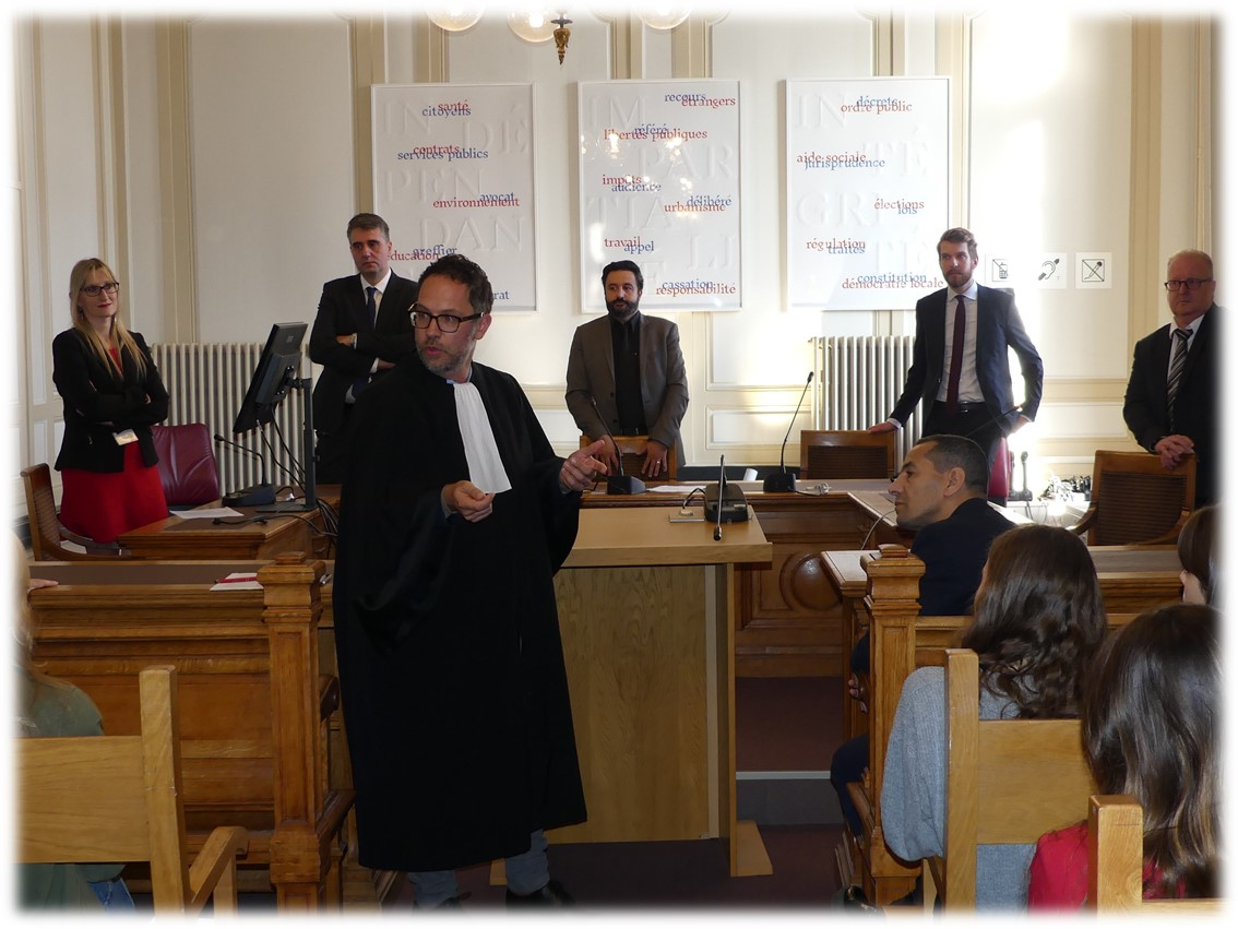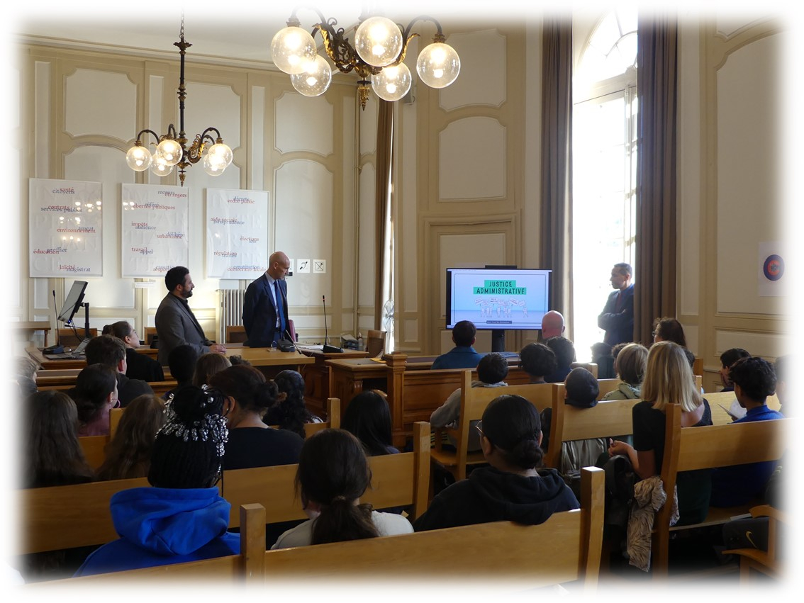 Après la diffusion d’une courte vidéo sur la justice administrative et d’un quizz interactif (téléphone portable requis pour cette séquence !), des magistrats et des greffiers de la cour et du tribunal ont simulé une audience : pour les lycéens, une affaire de harcèlement scolaire a été présentée et pour les collégiens, une affaire d’interdiction d’accès au stade d’un supporter.