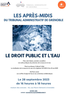 Les premières rencontres du droit public, initiées par le tribunal administratif avec la collaboration du barreau de Grenoble et de la faculté de droit, dont le thème était « Le droit public et l’eau » ont permis à un public d’une centaine de personnes composé d’avocats, d’universitaires, d’étudiants et de membres de la société civile, d’entendre les interventions de Mme Julie Holzem, première conseillère au tribunal administratif de Grenoble, de Mme le professeur Guilloud-Colliat, professeur de droit européen à l’UGA et de Me Pierre Janot, avocat au barreau de Grenoble.