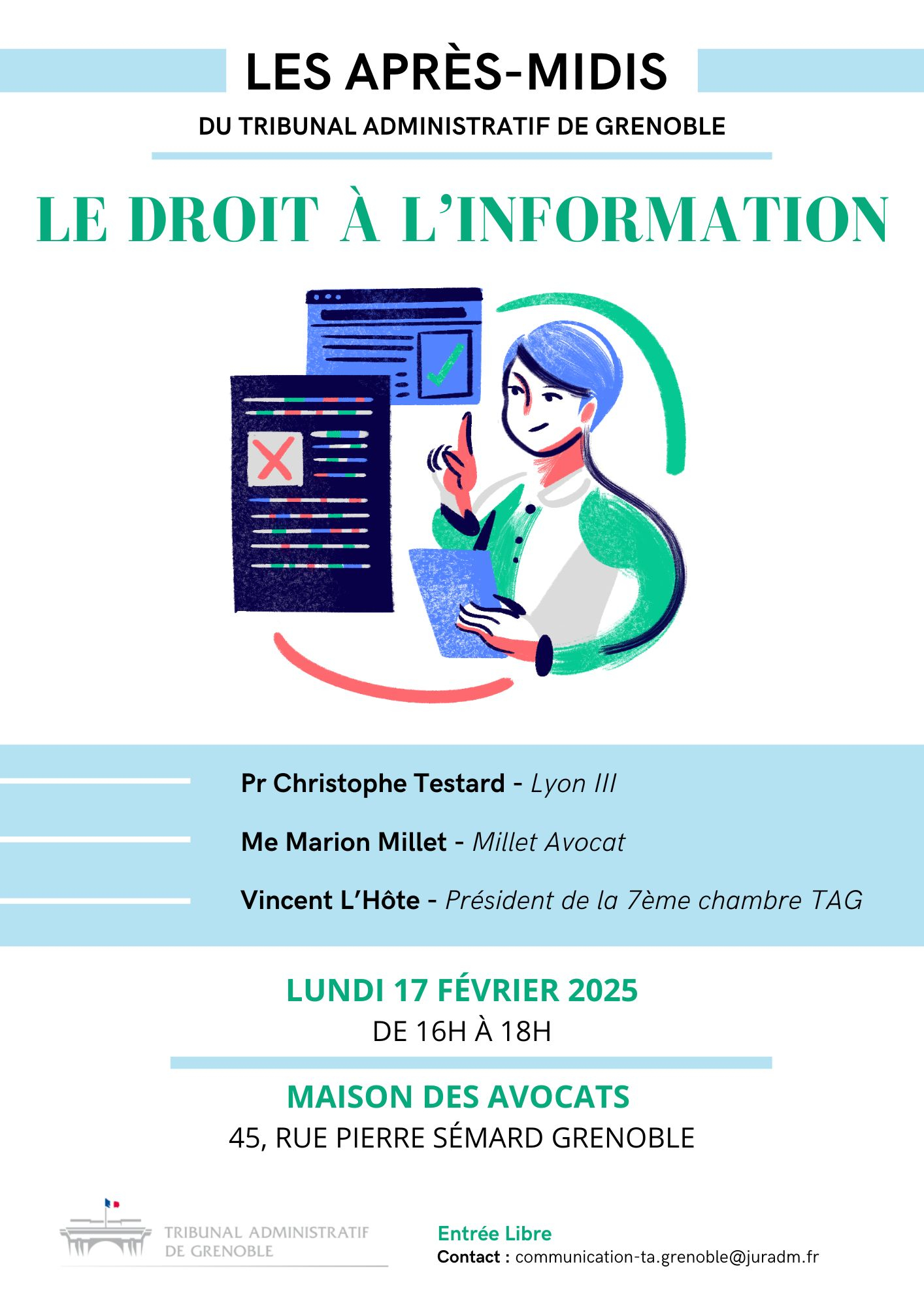 Le tribunal administratif de Grenoble poursuit son cycle de conférences « Les après-midis du tribunal administratif » avec une nouvelle édition consacrée au droit à l’information. Cet événement se tiendra le lundi 17 février 2025, de 16h à 18h, à la Maison des Avocats (45, rue Pierre Sémard, Grenoble).