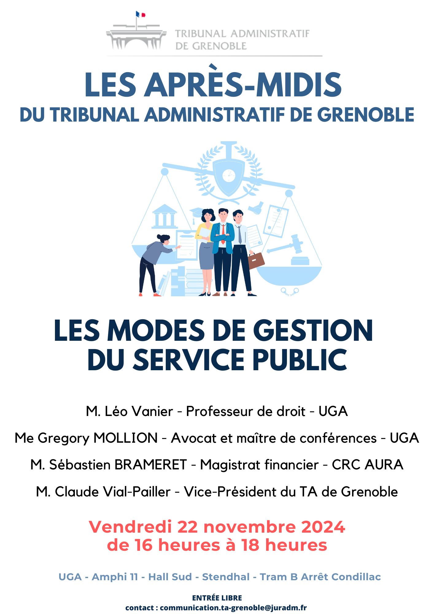 Le tribunal administratif de Grenoble organise la quatrième édition de son cycle de conférence « Les après-midi du tribunal administratif », cette fois consacrée aux modes de gestion du service public. Cette conférence se déroulera le 22 novembre 2024 de 16h à 18h sur le campus universitaire (bâtiments Stendhal, hall sud, amphi 11).