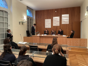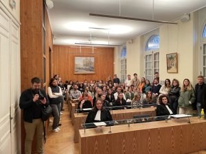 La deuxième partie de la soirée a été consacrée à une audience fictive, sur le thème de la responsabilité sans faute de l’Etat pour les dommages causés par la prolifération des animaux sauvages appartenant à des espèces protégées, en l’espèce des cormorans prélevant des poissons dans les étangs d’un pisciculteur. L’auditoire a été captivé par les conclusions du rapporteur public et les plaidoiries des avocates.