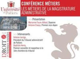 Lors d’une conférence qui s’est tenue lundi 11 mars à la faculté de droit de Poitiers, en présence de Mme Marianne Faure-Abbad, doyenne, et de M. Antoine Claeys, premier vice-doyen, M. Antoine Jarrige, président du tribunal administratif, et M. Baptiste Henry, rapporteur à la 1ère chambre, ont présenté aux étudiants de licence et de master le métier de magistrat administratif.